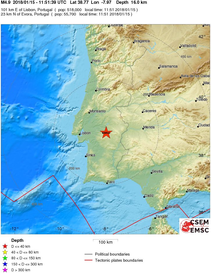 This earthquake has a depth of 16 kilometers and is located at a distance of 100 kilometers east of Lisbon, not far from Évora. Some witnesses are reported until the city of Coimbra.