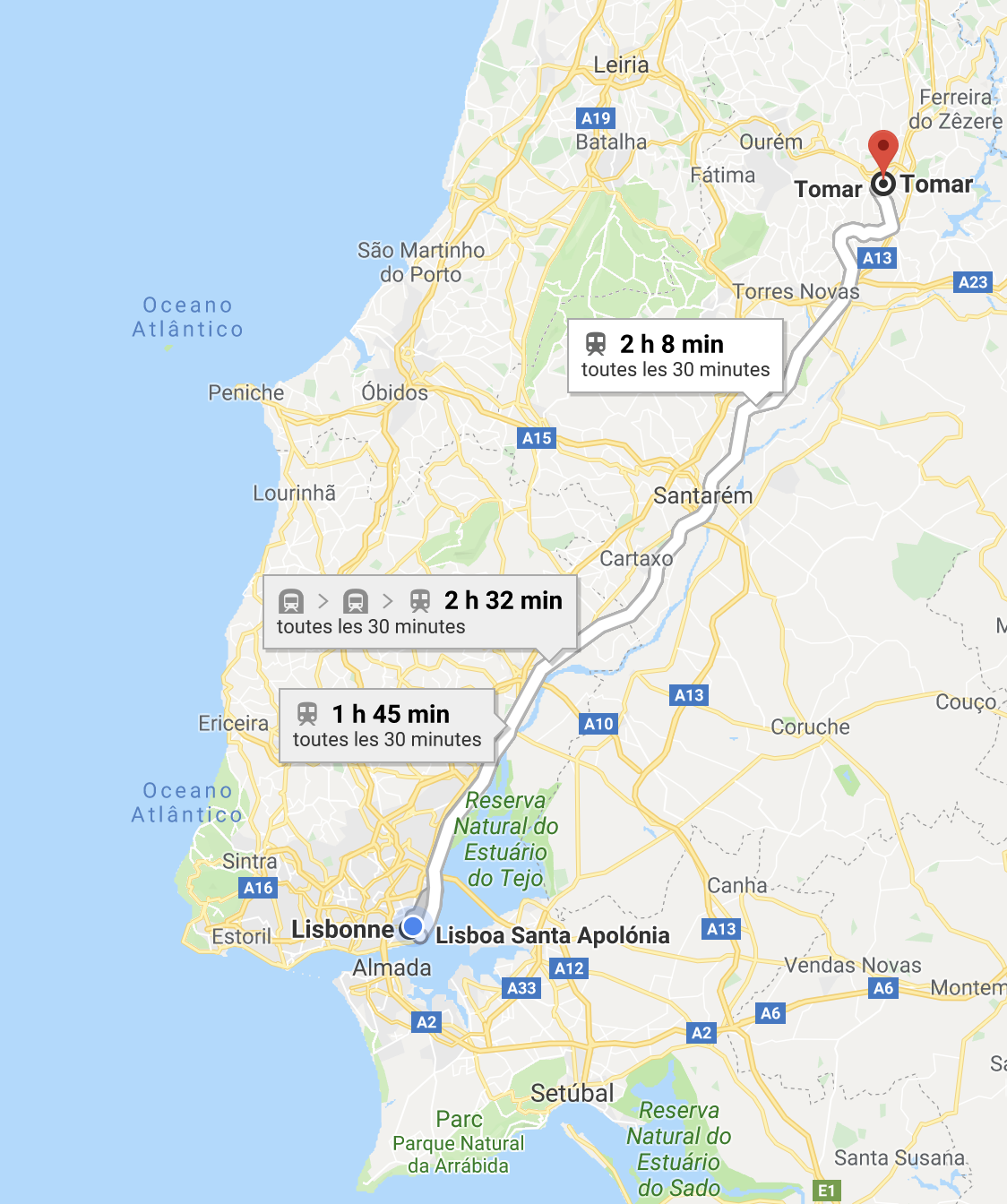 Tomar is located 140 km north-east of Lisbon and is therefore more easily and quickly visited by car : there is about 1 hour 20 of highway taking the A1 toll road. The railway line connecting Lisbon to Tomar is a regional line (and thus rather slow) whose terminus is to Tomar itself. It's easy to visit Tomar from Lisbon. You will see below the different ways to go to visit Tomar from Lisbon, by car and by train.
