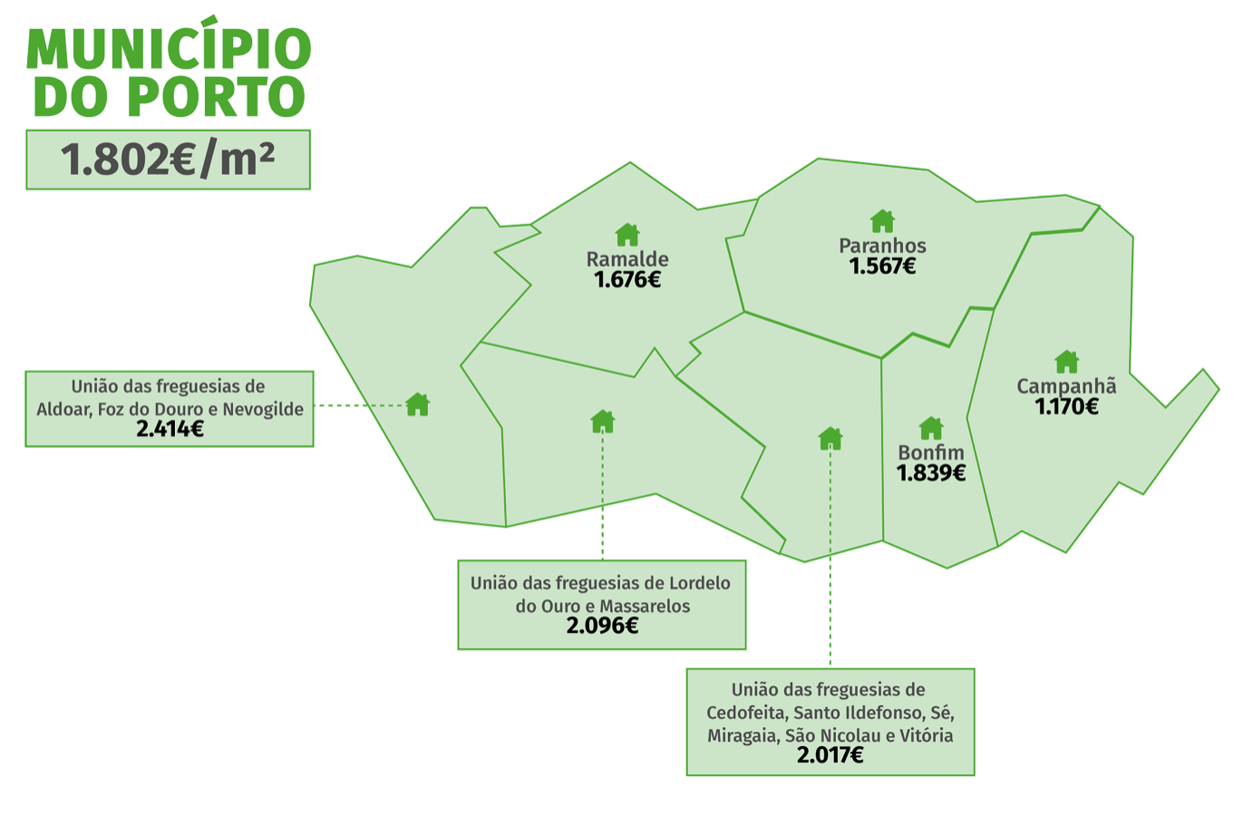 Pour ceux qui envisagent d'acheter une maison, il faut savoir que c'est dans l'Union des paroisses d'Aldoar, Foz do Douro et Nevogilde que les prix sont plus élevés. Dans ce domaine, le mètre carré coûte déjà 2 414 euros, en hausse de 7,3%. La zone la plus économique est Campanhã, qui reste la paroisse la moins chère de Porto, avec un mètre carré coûtant 1.170 euros, mais ayant augmenté de 18,7%, plus que la moyenne de la ville.
