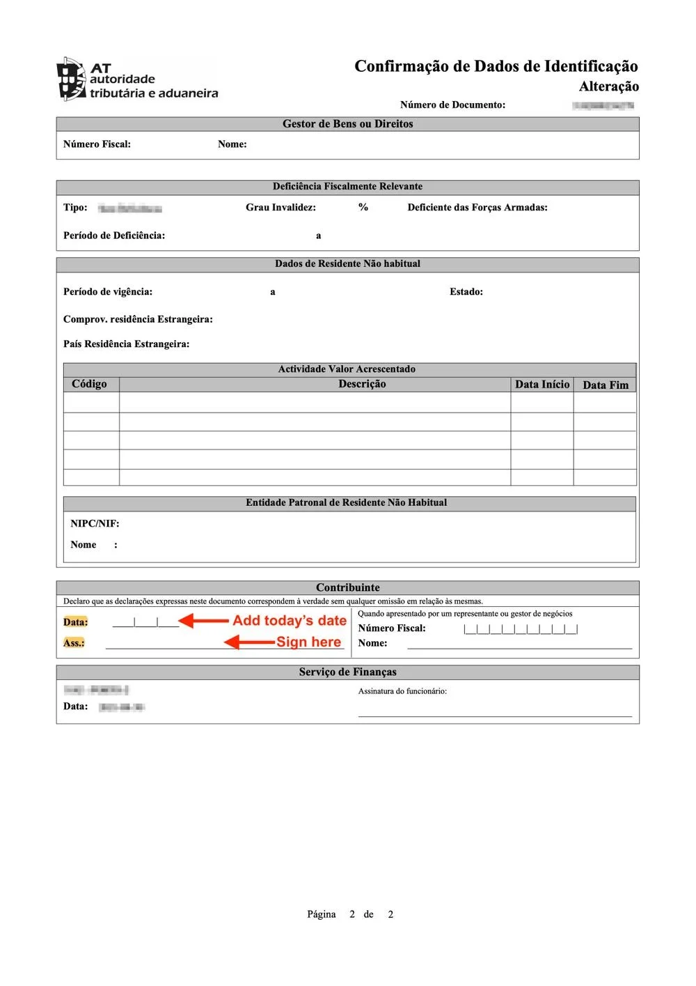 Renvoyez ce document au bureau des impôts en répondant au fil de discussion et en joignant le document de 2 pages signé. Cela doit être effectué dans les 48 heures suivant la réception du document Alteração.