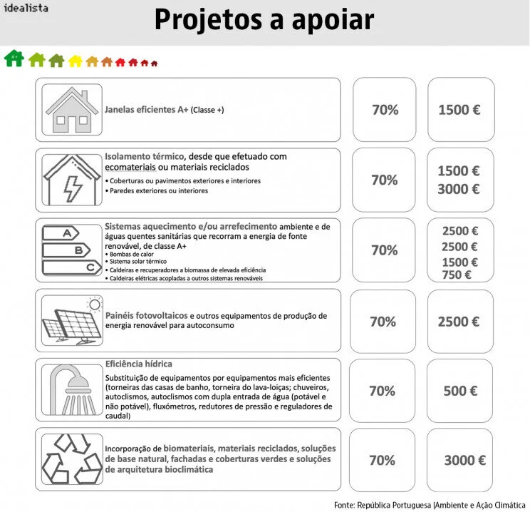 Pour pouvoir bénéficier de cette aide, il faut que le bien date d’avant 2006 et qu’il soit sur le Portugal continental. Avec cette incitation il est possible de se procurer des panneaux solaires, des nouvelles fenêtres, refaire l’isolation du toit ou bien renouveler un vieux chauffage.