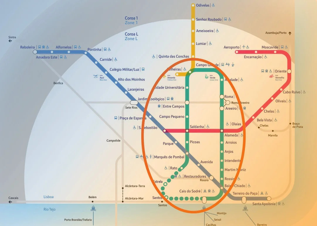 À Lisbonne, le projet inclus une liaison entre la station de Rato (actuelle Linha Amarela) et Cais do Sodré (Ligne verte), avec deux nouvelles stations à Estrela et Santos.