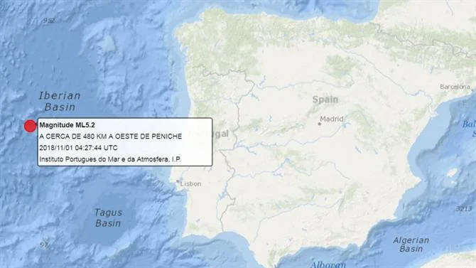 L’Institut portugais de la mer et de l’atmosphère a indiqué que ce matin, à 4 h 27, un séisme d’une magnitude de 5,2 sur l’échelle de Richter avait été enregistré et que son épicentre était situé à environ 480 km à l’ouest de Peniche.